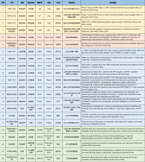 在肺癌、妇科肿瘤、淋巴瘤、膀胱癌、头颈肿瘤、黑色素瘤、肉瘤、鼻咽癌、脊索瘤、唾液腺癌、胸腺癌、硬纤维瘤、涎腺导管癌等其他多个疾病领域,卡瑞利珠单抗、阿帕替尼、阿得贝利单抗、吡咯替尼、达尔西利、氟唑帕利、法米替尼、SHR-1501、瑞拉芙普-α(SHR-1701)、SHR-1826、瑞康曲妥珠单抗(SHR-A1811)、SHR-A1912、SHR-A2102等抗肿瘤创新药相关研究一共入选了4项口头报告、2项快速口头报告、11项壁报展示和4项线上发表,彰显了AG电子医药强劲的研发实力。此外,昂丹司琼口溶膜在防治化疗导致的恶心呕吐方面展现出了良好的疗效,本次ASCO年会有1项研究线上发表。
